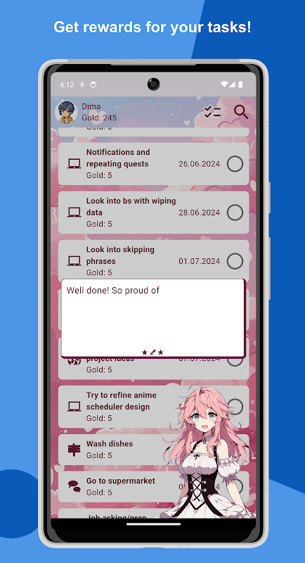 ToDo quest یک برنامه لیست کارهای بازی شده با همراهان زیبا است! در میان کارهای روزانه خود به راحتی مورد علاقه و والس خود را انتخاب کنید