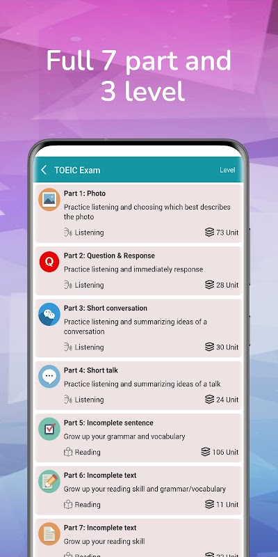 • The categories part covers all aspects of the exam: Photos, Question-Response, Short Conversations, Short Talks, Incomplete Sentences, Text Completion, Reading comprehension