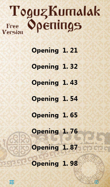 کاملترین کتابخانه برای باز کردن togyzkumalak (5 حرکت اولیه سفید و سیاه). این برنامه بر اساس آمار تعداد زیادی از بازی ها بهترین گزینه ها را پیشنهاد می کند. این برنامه برای بازیکنان تازه کار و استادان با تجربه بازی togyz kumalak (toguz korgool) مفید خواهد بود.