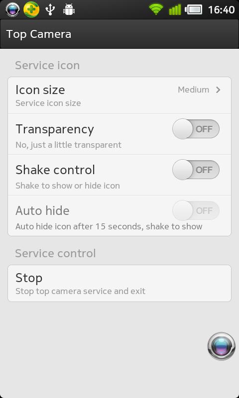 This app provides a camera button always on the top of the screen! Whatever you are doing (playing games, surfing the internet, or use any other apps) on the phone, you can click this float button to launch the camera, and then have a quick shot. It is really on the top of anything. Never miss any scene that is worth capturing.