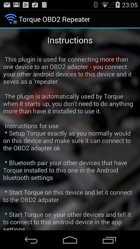 برای مثال، شما ممکن است در حال اجرا گشتاور در آندروید خود را در اتومبیل دستگاه و یا قرص - شما می توانید از این افزونه برای به اشتراک گذاشتن اتصال OBD2 استفاده و اتصال گشتاور در حال اجرا بر روی تلفن همراه خود را نیز به
