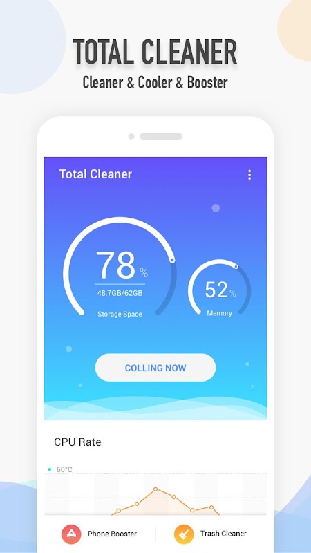 Total cleaner is a free Cache Cleaner, Memory Optimizer, Speed Booster and Phone Cooler for Android! With Total cleaner, you can clean junk file, cache, ads, unnecessary background apps, cool down CPU temperature and boost mobile memory to make your phone faster. Even Android phones with slow processor and low memory can have a better performance after clean and boost.