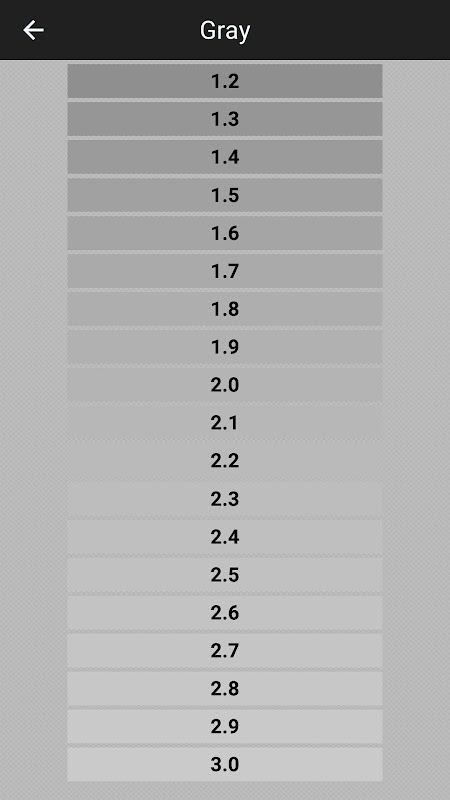 تستهای رنگ پنج دکمه دیگر را نشان میدهد، یکی برای هر آزمایش رنگ موجود: خلوص، گرادیان، مقیاس، سایهها و تست گاما. این تستها به شما این امکان را میدهند که به سادگی یکنواختی رنگهای اصلی روی صفحه، کنتراست آنها در سطح فعلی روشنایی را بررسی کنید و ببینید چه تعداد از سایههای آنها ممکن است شناسایی شوند. تست گاما مجموعهای از سایههای رنگی را نمایش میدهد که به شما امکان میدهد مقدار گاما را بیابید (این نشان میدهد که سطح روشنایی دستگاه شما چقدر سیگنال ورودی را منعکس میکند).