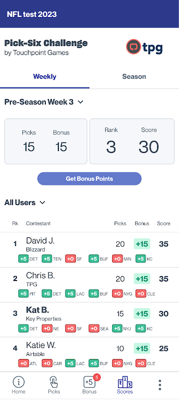برنامه همراه برای کاربران استخر بازی های Touchpoint. شرکت کنندگان در استخرهای Pick-Six یا Golf Challenge می توانند برای تجربه بهتر موبایل به برنامه Touchpoint Games وارد شوند! فقط با استفاده از همان ایمیل وارد شوید و استخرهای خود را پیدا کنید.