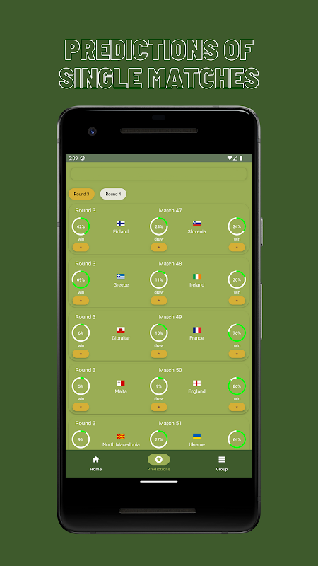 Tournament Simulator به شما کمک می کند مسابقات بزرگ جهان را با تیم های مورد علاقه خود شبیه سازی کنید. این به شما این امکان را می دهد که مسابقات احتمالی را در مراحل بعدی مسابقات ببینید و چندین بازی را در هر تورنمنت ذخیره کنید. این برنامه همچنین ویژگی هایی را ارائه می دهد که در آنها به سایر کاربران ملحق می شوید تا پیش بینی ها را در زمان واقعی به اشتراک بگذارید.