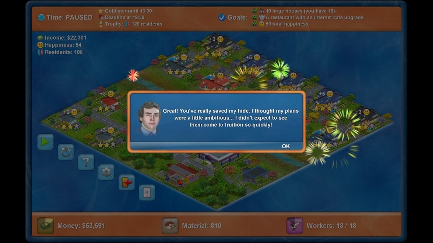 از این بازی شبیه سازی کلاسیک و ساده مدیریت زمان از سری محبوب Townopolis-Romopolis-Megapolis لذت ببرید. با ساختن محله های کوچک در منطقه ای محدود با منابع محدود و در زمان محدود به اهداف مختلف دست یابید. اما نگران نباشید - میتوانید در هر زمانی بازی را متوقف کنید یا در صورت تمایل بدون محدودیت زمانی بازی کنید.