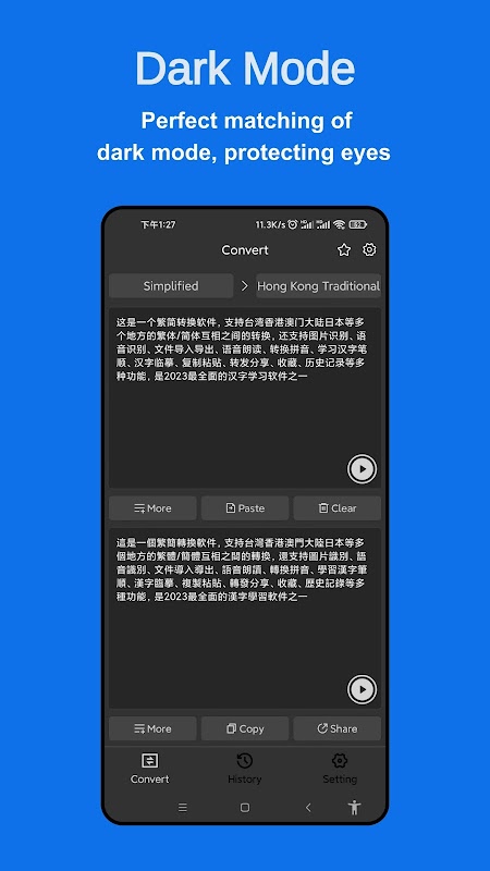 7. از بینایی خود محافظت کنید: برنامه ما کاملاً با تم شب، تم آبی و تم سبز مطابقت دارد که می تواند از بینایی شما محافظت کند. هنگام خواندن و استفاده از ابزار تبدیل حروف چینی، نیازی نیست نگران فشار بیش از حد به چشمان خود باشید.