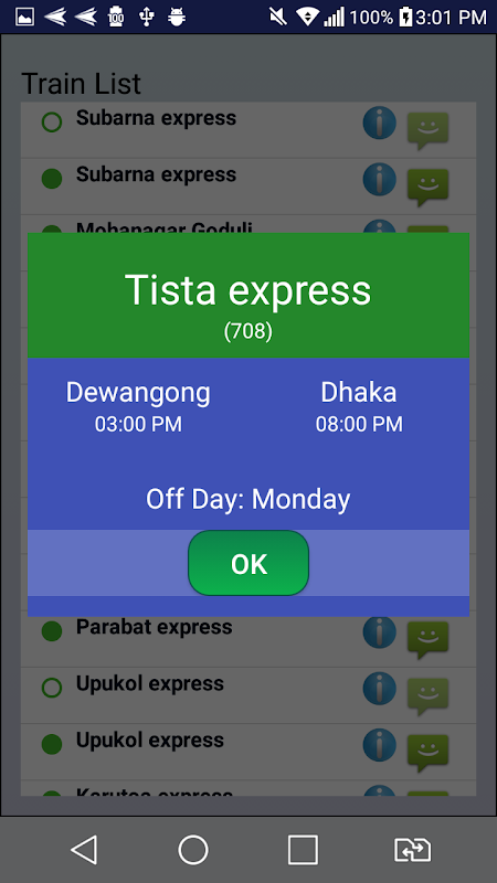 After getting started, you will get a list of all Intercity train in Bangladesh. You can get all train information such as source, destination, off day, departure and arrival time(approximate). You can also get current status(Online/Offline) of every train.