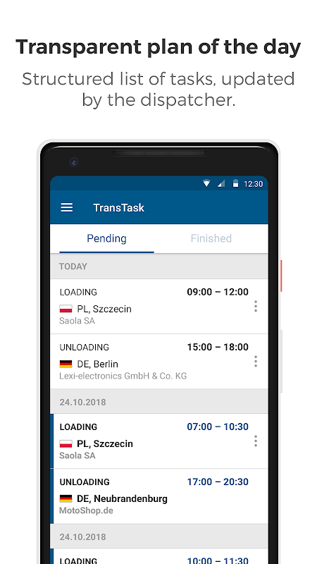 برنامه TransTask باعث می شود تا راننده برای تکمیل وظایف و اجازه دادن به آنها را با جزئیات در نظم اعدام مشاهده کند. با توجه به برنامه، راننده می تواند به سرعت با dispatcher تماس بگیرد، هر مشکلی و تاخیر را گزارش کند.