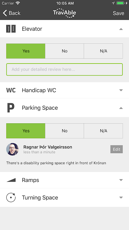 TravAble است برای همه استفاده کنید. نه فقط کاربران با تحرک چرخ، بلکه دوستان و خانواده، خدمات اجتماعی و دستیاران شخصی و یا فقط هر کسی در نیاز به اطلاعات در مورد دسترسی به خدمات مختلف است.