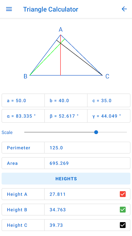 علاوه بر این، برنامه محیط، مساحت و سه ارتفاع متمایز مثلث را محاسبه می کند. همچنین یک نمایش بصری از مثلث در کنار ارتفاعات متناظر آن ارائه می دهد. اندازه گیری زاویه در هر دو درجه و رادیان موجود است.