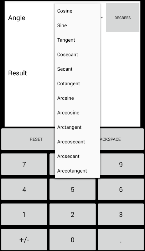 Sine,Cosine,Tangent,Cosecant,Secant,Cotangent,Arcsine,Arcosine,Arctangent,Arccosecant,Arcsecant, and Arccotangent