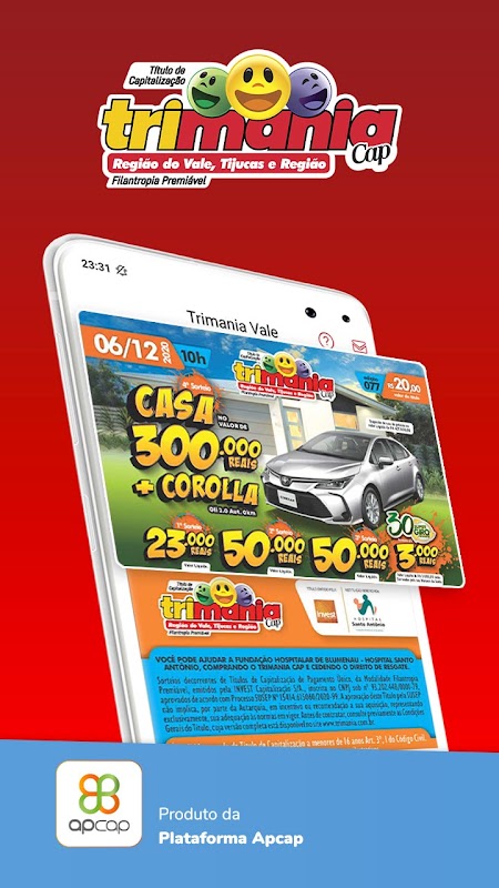 TRIMANIA CAP یک اوراق قرضه سرمایهگذاری تک پرداختی، از روش اهدای بشردوستانه است، که در مناطق Vale، Tijucas و Region فعالیت میکند، توسط SUSEP تأیید شده و توسط Kovr Capitalização صادر شده است (CNPJ No. 93.202.448/0001-79). علاوه بر ارائه حق مشارکت در قرعه کشی ها، با TRIMANIA CAP می توانید در توسعه و تامین مالی FUNDAÇÃO HOSPITALAR DE BLUMENAU - SANTO ANTÔNIO که تحت شماره CNPJ nº 82.654.088/0001-20 ثبت شده است، مشارکت کنید. بازخرید عنوان خود، تولید منابعی که در ساخت بالهای جدید و همچنین در اصلاحات ساختاری و دستیابی به تجهیزات بیمارستانی جدید سرمایهگذاری خواهد شد. درباره کار و پروژههای FUNDAÇÃO HOSPITALAR DE BLUMENAU - SANTO ANTÔNIO در وب سایت بیشتر بدانید. : www.hsan.com