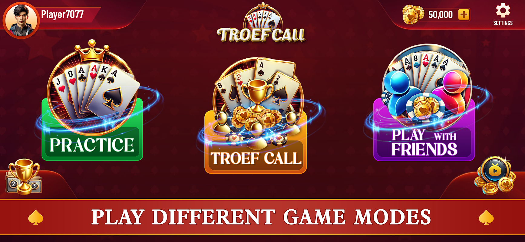 به صورت انفرادی در برابر هوش مصنوعی هوشمند بازی کنید یا دوستان خود را در حالت چندنفره بلادرنگ به چالش بکشید. برنده خود را انتخاب کنید، بر استراتژی خود مسلط شوید و بر جدول مسلط شوید. چه یک بازیکن معمولی یا یک حرفه ای رقابتی باشید، TroefCall گیم پلی عمیق، طعم فرهنگی و جوایز هیجان انگیز را ارائه می دهد.