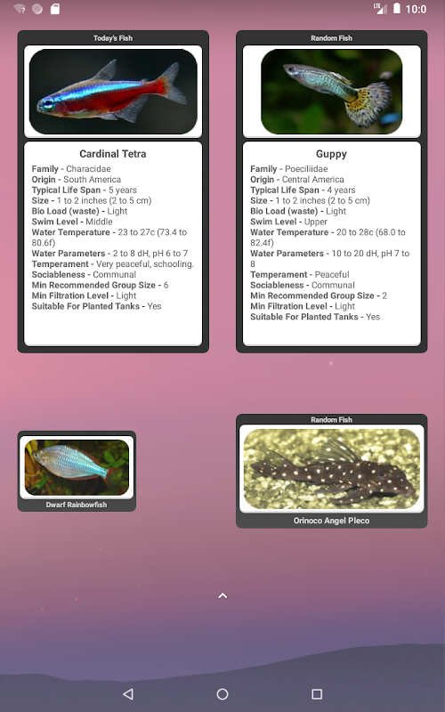 ✪ بهعنوان ویجتهای مستقل یا در حالت یکپارچهسازی کار میکند (حالت ادغام نیاز به نصب Tropical Fish Guide Pocket Edition نسخه ۲.۷۹ یا بالاتر دارد. این امکان دسترسی به ویژگیهای مورد علاقه و یادداشت شخصی TFGPE را مستقیماً در نمایههای ویجت فراهم میکند).
