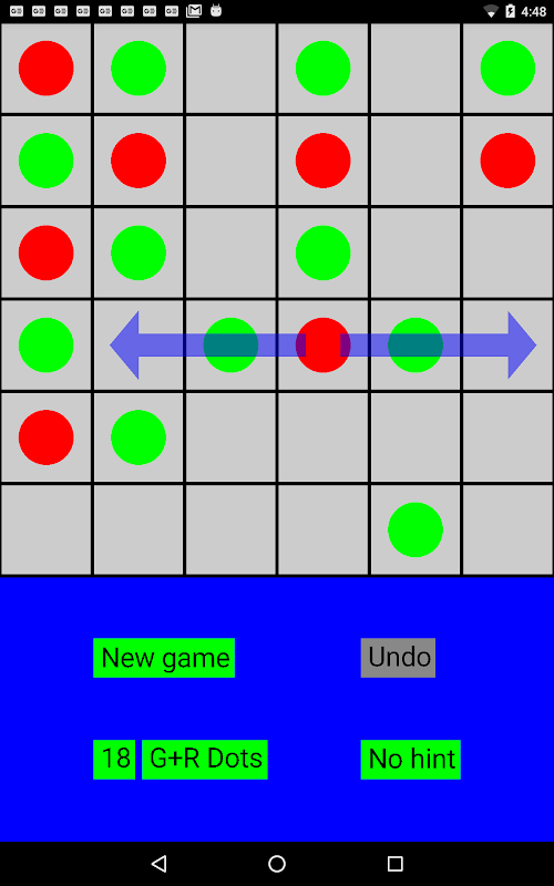 You can play in the Hint mode. Each move will be shown by an arrow. Touch the end of the arrow to make a move. If you play in the No hint mode, you need to decide which dot to move.
