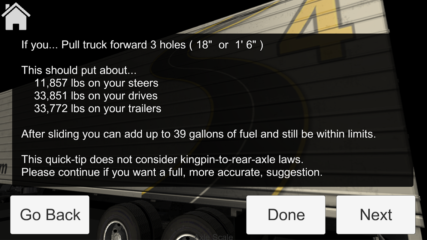 This app makes it quick and easy for truck drivers, like you, to get your loads legal. We calculate how many holes to slide and what holes follow bridge laws (kingpin to rear-axle laws). More importantly, if you have to puddle jump, we tell you how much fuel to add every time you need to fill up!
