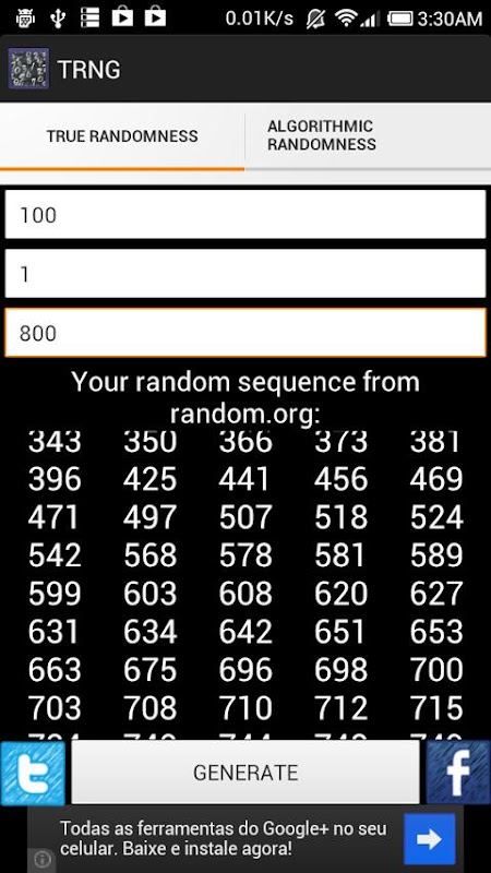 This app can generate True* Random Numbers (sequences) and Pseudo-random or Algorithmic random numbers (sequences). The numbers can be copied to clipboard or shared through facebook and twitter.