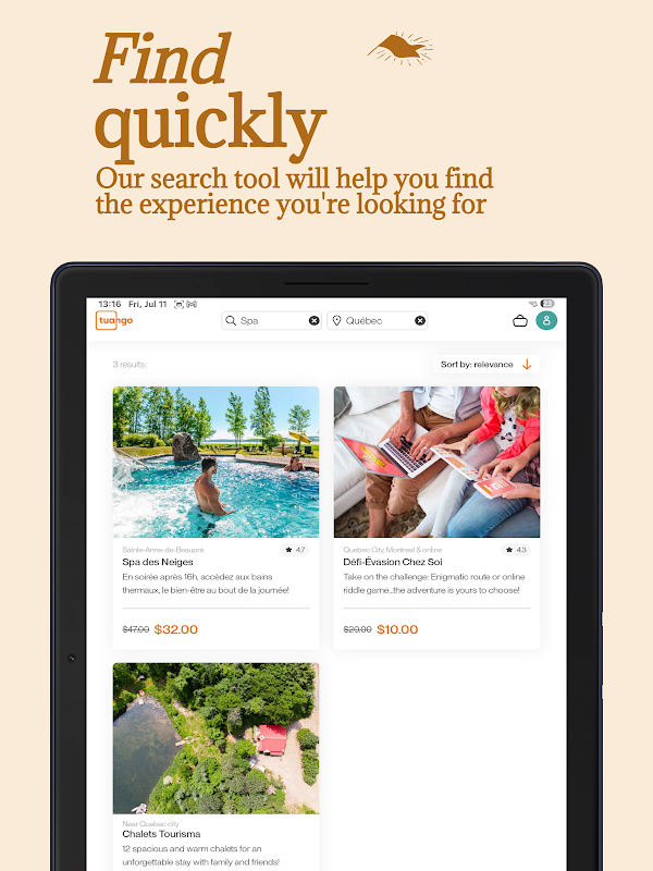 اکنون 15 سال است که Tuango معاملاتی را برای کشف در سراسر کبک ارائه می دهد. اکنون، با برنامه کاملاً جدید آن، می توانید به راحتی بهترین اسپا، نمایش ها، استراحت ها، رستوران ها، فعالیت ها و موارد دیگر را کشف کنید. این برنامه جدید فقط برای شما نیست. اکنون به تعداد زیادی ویژگی دسترسی دارید: