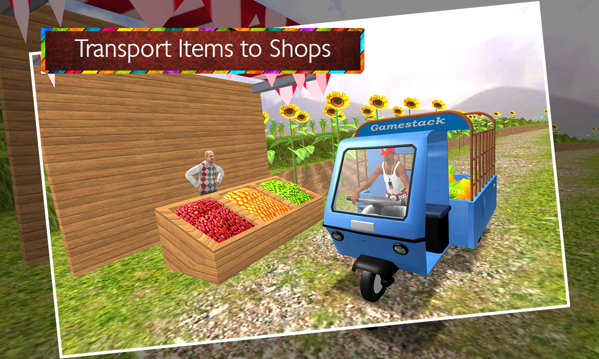 Game include both city and mountain area. go to the fields and collect vegetables fruits and other goods to supply them to shops in the market. environment of this game is beautiful and set in out side of the city and country side. drive your rickshaw from the starting position and find the targeted location where goods are ready to loaded on cargo, supply that goods to the market where need.