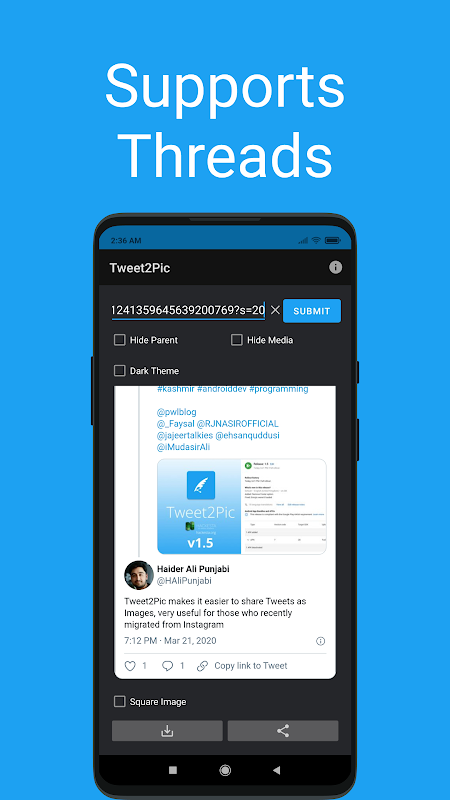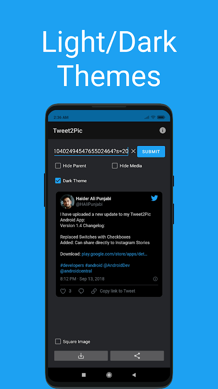 یا پیوند یک توییت را در برنامه کپی کنید یا پیوند این برنامه را به اشتراک بگذارید تا تصویر را برای شما ایجاد کند. همچنین میتوانید انتخاب کنید که توییت در تم تیره یا روشن باشد.