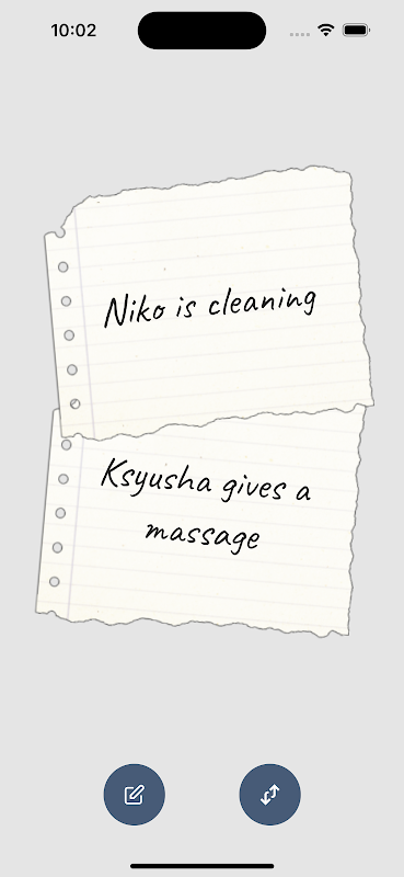 می توانید روی برگه ها هر چه می خواهید بنویسید. به عنوان مثال، "بله / نه" یا "کسو در حال تمیز کردن است / نیکو در حال انجام ماساژ است" یا "شام در خانه / شام خارج از خانه" و غیره. همه چیز فقط توسط تخیل شما محدود می شود.