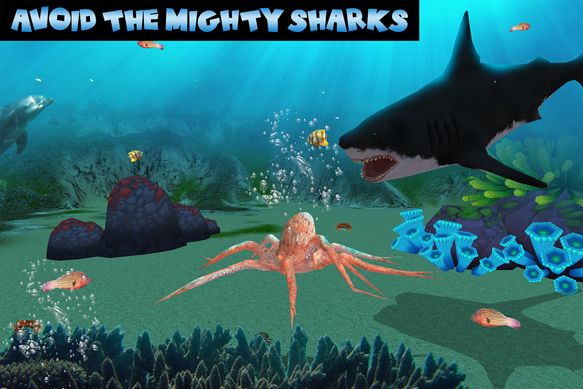 Live the life of strange underwater creature from baby octopus to the adult one! Find your mate and have the opportunity to create your own family and raise your little offsprings!You like sea animals or aquarium animal simulator games then this game is perfect for you.Watch one of the most amazing predators like killer whales or the great white sharks how they hunt for other animals for surviving.Survive in sea against underwater beasts.Level up your skills and buy some power-ups to improve your octopus.Enjoy your free swimming, chase different fish and cruel sharks, because you’re a truly predator!Swim carefully into the Deepwater environment to search a gigantic squid that may will attack.Open world environment with several tentacles in the deep grave!