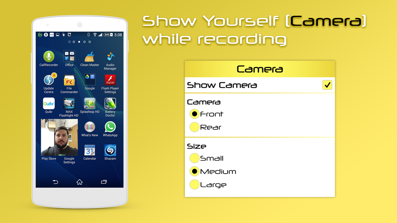 ضبط ویدئو از صفحه نمایش گوشی خود را با یک لمس و به فرد ویدئو های خود را با صدا، پیش نمایش دوربین، متن و آرم.