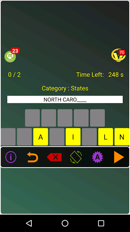 This is a super fun, highly addictive and customizable word game. The objective of this game is to solve a puzzle in which the letters of a word have been rearranged. You have to rearrange the letters in the right order and discover the word. You can also use a hint to guess the word. If you have guess the original word correctly, you win ! There are more than 20 categories from which words are chosen - from cars to states to sports to vocabulary and much more. You can select the categories that interest you most.
