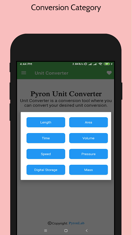 این یک برنامه مبدل واحد رایگان است که در آن کاربران می توانند واحدهای زیادی را از یک فرم به فرم دیگر تبدیل کنند. دسته های اندازه گیری زیادی وجود دارد