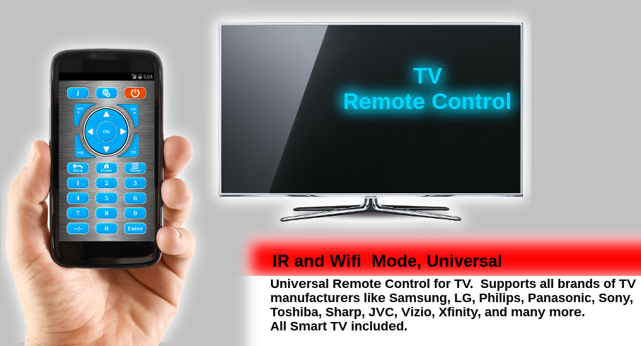 Universal TV Remote is an IR and wifi based universal remote control for all TV devices, which is compatible with more popular brands of TV and smart TV such as Samsung TV, LG TV, Sony TV, Panasonic TV, Philips TV, Sharp TV and many more.