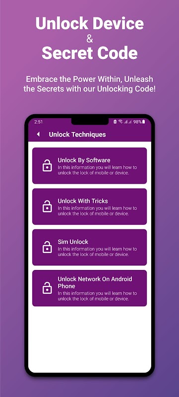 با استفاده از کدهای مخفی و برنامه باز کردن قفل دستگاه، در عرض چند دقیقه استاد گوشی اندرویدی خود خواهید شد. قفل دستگاه خود را سریع و ایمن باز کنید و برنامه از چندین کد مخفی پشتیبانی می کند. هنگامی که این کدها به صورت دستی از تلفن شما تایپ می شوند، برخی از آمارهای ساده را در مورد دستگاه شما نشان می دهند.