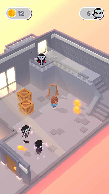 Take on the role of a vampire slayer! Direct sunlight onto undead by moving mirrors and boxes. Collect coins and open chests, but try not to be seen by the undead. Clear the castle from vampires and show who is the real hero!