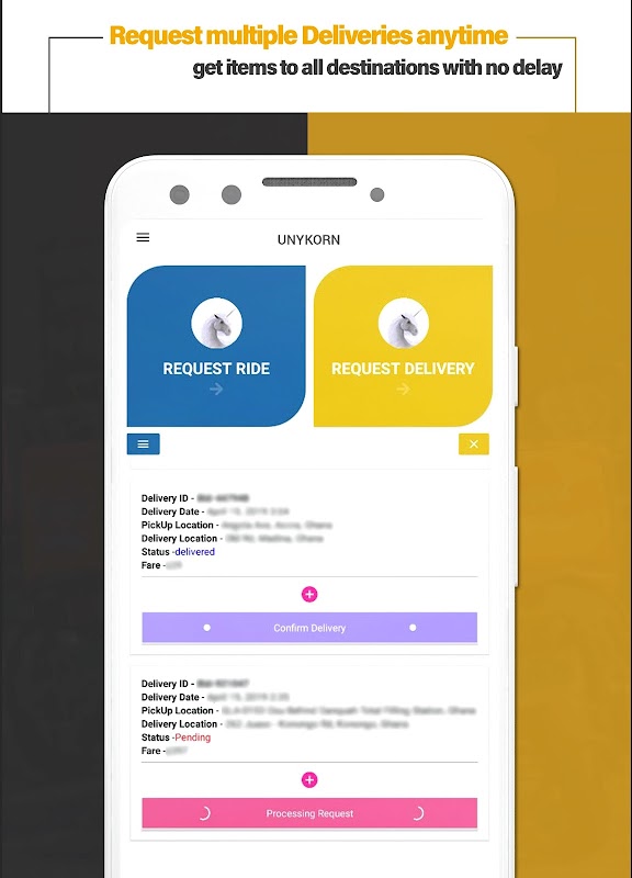 Unykorn is a ride request and instant or scheduled delivery booking app providing fast, secured and reliable services to its clients.