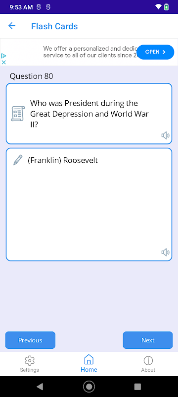 از این برنامه برای یادگیری پاسخ تمام سوالات استفاده کنید و در واقع آزمون شهروندی USCIS را تمرین کنید. دارای فلش کارت برای هر 100 سوال. آنها را به ترتیب تصادفی یا به ترتیب ارائه شده در اسناد USCIS مشاهده کنید. یک آزمون تمرینی شرکت کنید و ببینید آیا می توانید به اندازه کافی نمره خوبی کسب کنید تا در آزمون مصاحبه واقعی قبول شوید.