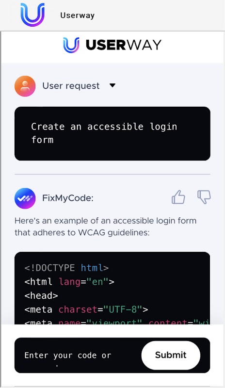 Userway یک کد نویسی است که می تواند از طریق اعلان های ساده ای که شما وارد می کنید کدهایی را برای شما تولید کند. فقط به زبان ساده آنچه را که می خواهید بگویید و کد را برای شما می نویسد