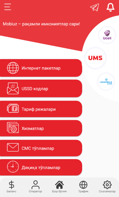 Dasturni o'rnatganingizdan so'ng O'zbekiston mobil aloqa operatorlari UMS Uzmobile Ucell Beeline va Perfectum haqida barcha Savollaringizga javoblar olasiz va quyidagi imkoniyatlarga ega bo'lasiz: