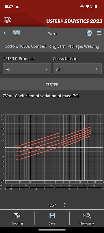 داده های معیار منحصر به فرد USTER® STATISTICS را می توان در نماهای مختلف مطابق با نیازهای فردی تجسم کرد. کاربران میتوانند مجموعهای از ابزارها و ویژگیهای کیفی ترجیحی را تعریف کنند و پیمایش به نتایج مورد نیاز را حتی سریعتر کنند. برای دسترسی سریع به نتایج پرکاربرد، میتوان آنها را بهعنوان «موارد دلخواه» در برنامه ذخیره کرد.