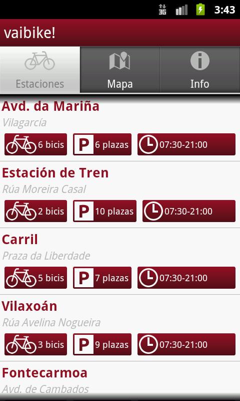 Aplicación para el Servicio de Alquiler de Bicis Públicas del Concello de Vilagarcía. Permite conocer el estado de las estaciones de alquiler, bicis disponibles, horario de funcionamiento y localización sobre un mapa de cada una de las estaciones. Además, permite localizar la estación más cercana a partir de la posición actual.