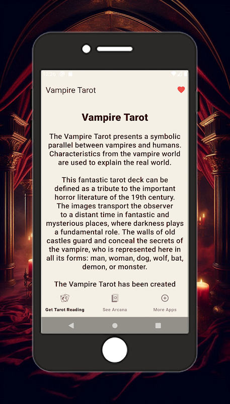 این عرشه تاروت خارق العاده را می توان به عنوان ادای احترام به ادبیات ترسناک مهم قرن نوزدهم تعریف کرد. این تصاویر ناظر را به دورانی دور در مکانهای خارقالعاده و اسرارآمیز منتقل میکنند، جایی که تاریکی نقش اساسی دارد. دیوارهای قلعه های قدیمی اسرار خون آشام را که در اینجا با تمام جلوه هایش به تصویر کشیده شده است محافظت می کنند و پنهان می کنند: مرد، زن، سگ، گرگ، خفاش، دیو یا هیولا.