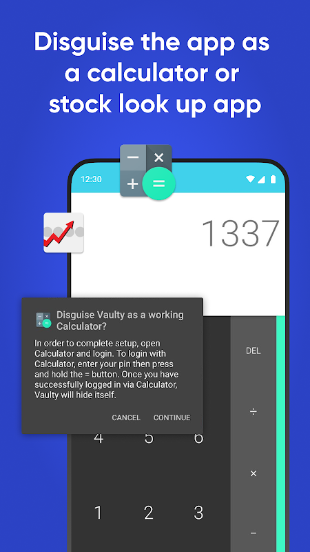 Vaulty را به عنوان یک ماشین حساب کاملاً کاربردی برای پین رمز عبور یا برنامه جستجوی سهام برای رمز عبور متنی پنهان کنید.