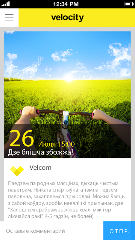 Keywords: velocity,велосити,velcom,велком,велосипед,вело,velo,покатушка,карта,маршруты,Беларусь,общение,bike