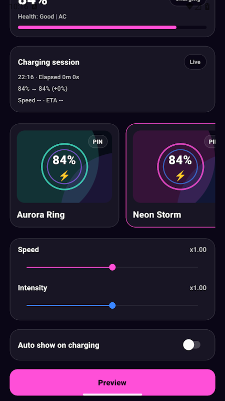 Real-time charging stats, including battery percent, health, and ETA.