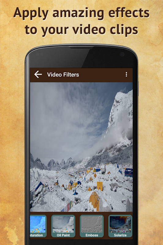 اثرات تصویری و فیلترها ویرایشگر ویرایشگر ویدئو قدرتمند است که می توانید ویرایش، اعمال فیلتر و اشتراک گذاری فیلم خود است. شما به راحتی می توانید داستان های تصویری خود را ویرایش کنید، ایجاد جلوه های سرد با گزینه های متعدد از فیلتر های شگفت انگیز. شما می توانید بیش از 20 اثر مانند قهوه ای، محصول، رنگ و روغن، posterize و، دایره اضافه کنید، شطرنجی کردن، مزین و غیره شما می توانید تر و تمیز، عصاره، تلنگر و چرخش ویدئو پس از ویرایش. این یک راه سرگرم کننده و آسان برای ویرایش فیلم و به اشتراک گذاری با برنامه های مانند فیس بوک، Whatsapp، توییتر، و بسیاری دیگر است.