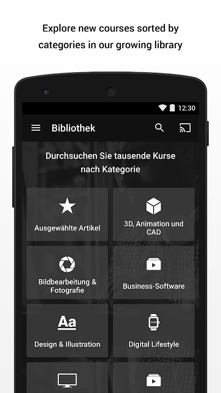 ● Browse and access the same courses as on the video2brain.com website.