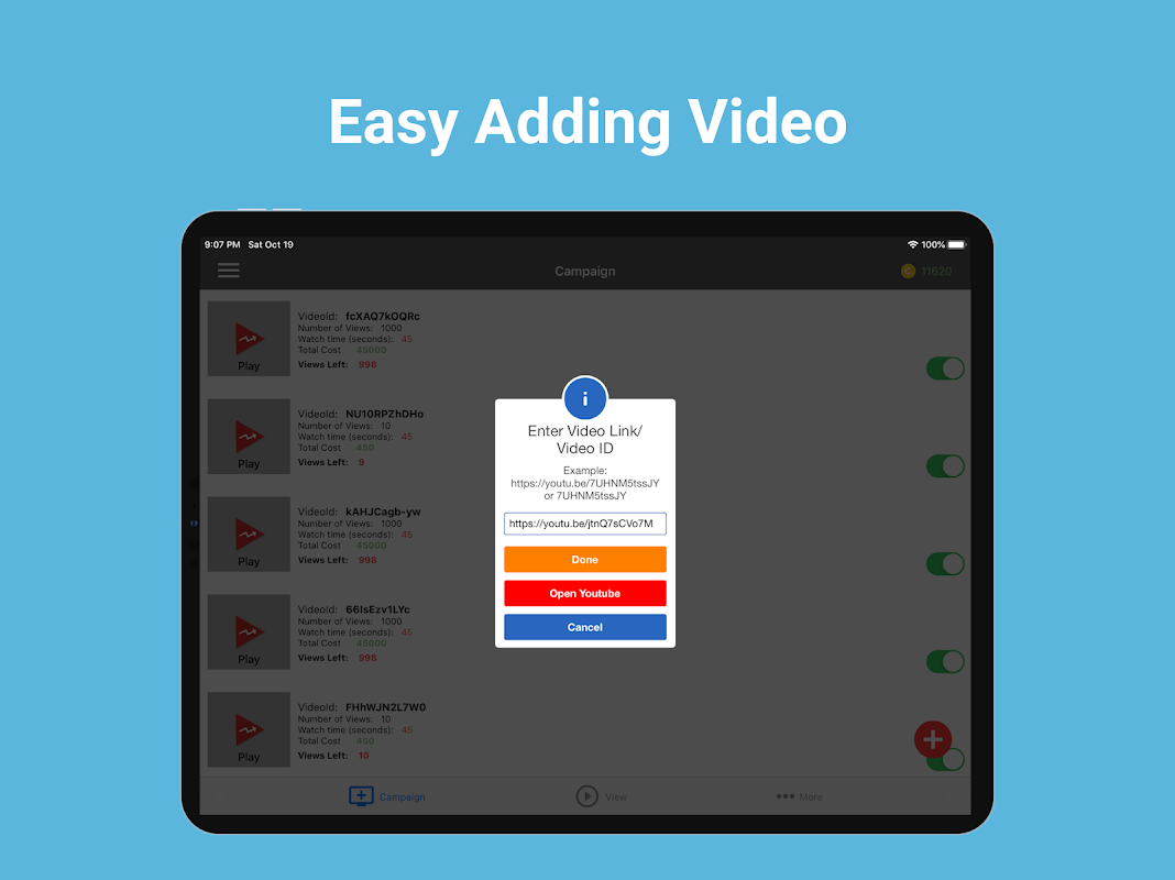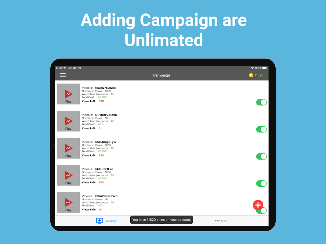 - Use coins to create campaigns (provide a video link or id) and start getting views for your own videos from REAL people just like you