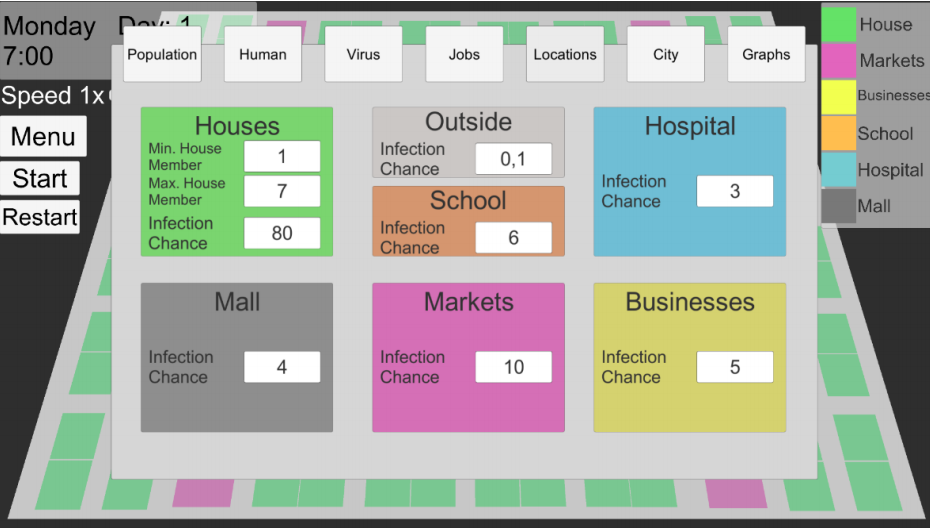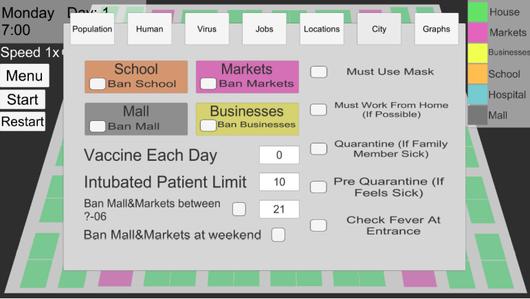مشخصات جمعیت ، ویروس ، مشاغل و مکانها را تغییر دهید تا سناریوی خود را ایجاد کنید. برای شهر خود تصمیم بگیرید و ببینید چه تاثیری دارد.