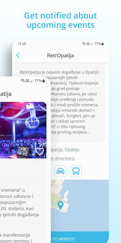 • رویدادها - با استفاده از برنامه Visit Kvarner از دست دادن رویدادها در Kvarner تقریباً غیرممکن است. رویدادها را براساس منطقه ، دسته یا فاصله از مکان فعلی خود پیدا کنید. رویدادها را در موارد دلخواه ذخیره کنید و برنامه قبل از شروع به شما یادآوری می کند! علاوه بر گزینه ذخیره رویدادهای مورد علاقه ، افزودن به تقویم های شخصی نیز امکان پذیر است.