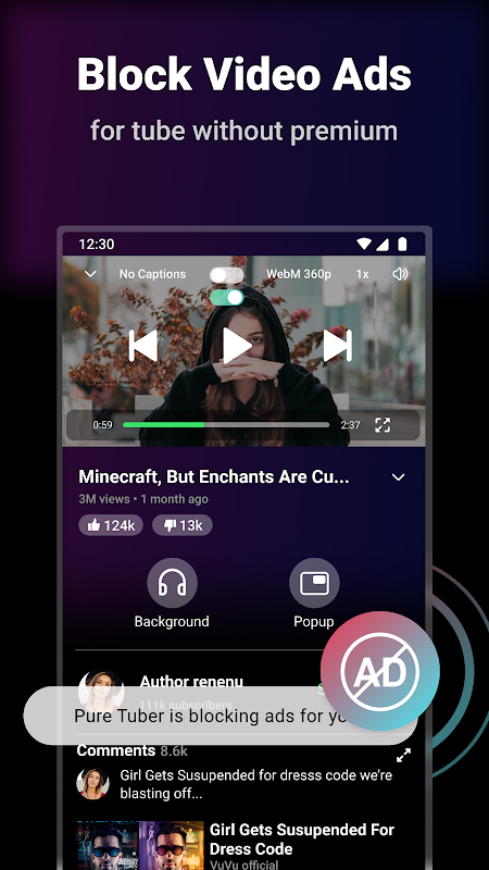 Viva Tube Vanced support background play and floating pop up mode, when you are working or sleeping, you are still able to enjoy tube videos and music, no ads will interrupt playback.