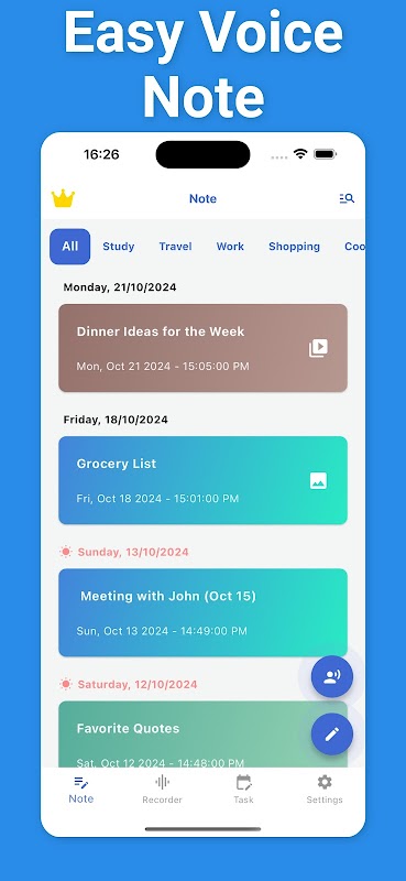 برای ورودی سریع با استفاده از صدای خود یادداشت ایجاد کنید. ضبط صدا با کیفیت بالا برای جلسات، سخنرانی ها یا استفاده شخصی.